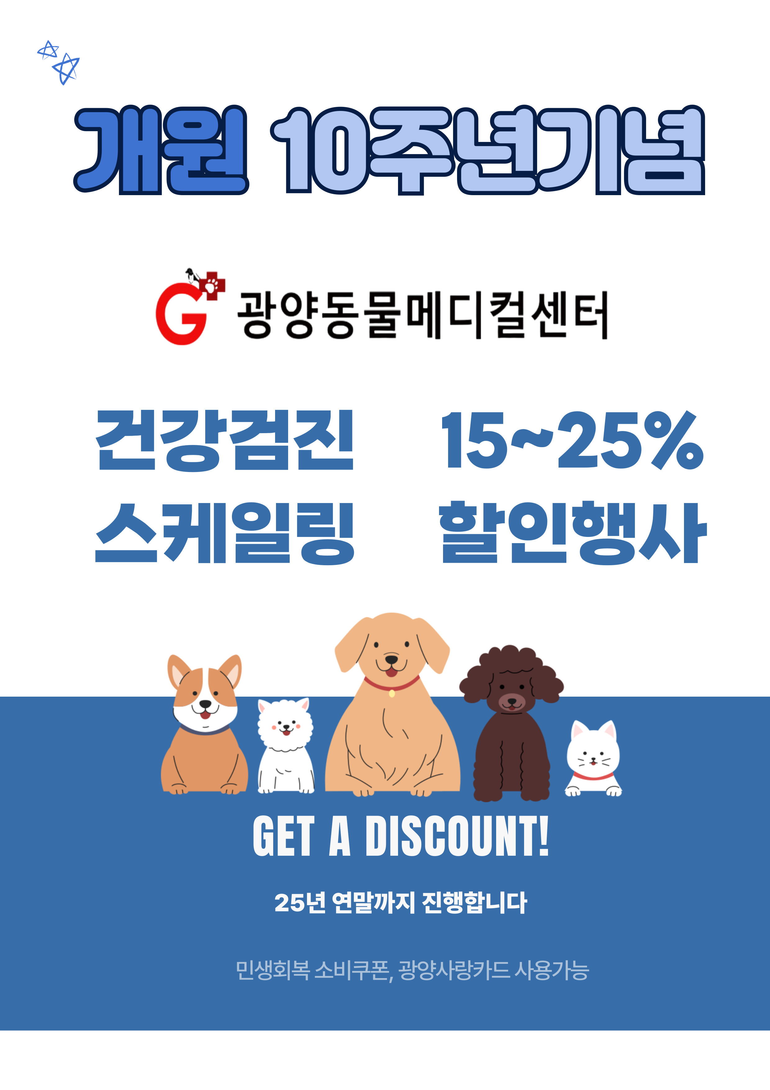 | 광양동물메디컬센터 개월 10주년 기념 건강 검진, 스케일링 할인 행사 (0) | 2025.07.09 |